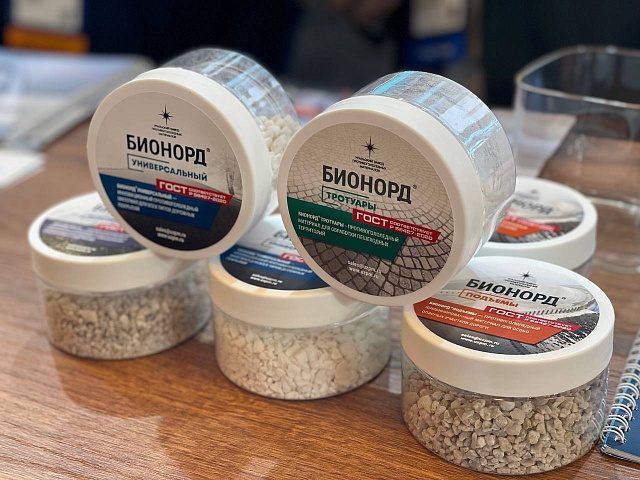Центральное место в экспозиции заняла линейка противогололедных материалов «Бионорд», включающая четыре специализированных состава: «Универсальный», «Жидкий», «Двухфазный» и «Тротуары». Каждая из формул разработана с учетом определенных типов покрытий и климатических особенностей российских регионов. Материалы сохраняют эффективность при многократном переходе температуры через нулевую отметку, начинают работать сразу после нанесения и препятствуют повторному образованию наледи, что существенно сокращает количество обработок. Антикоррозионные добавки в составе защищают металлические элементы транспорта и городской инфраструктуры от разрушительного воздействия солей.